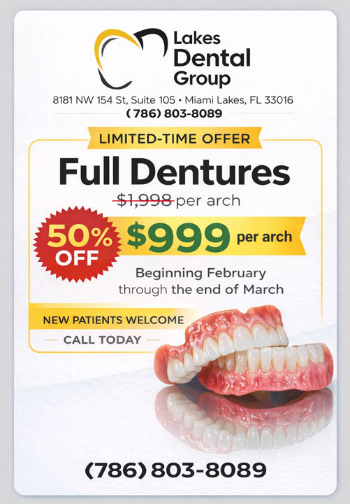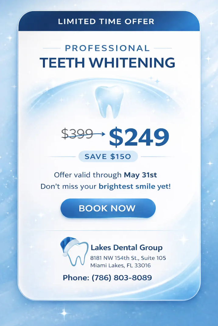 Lakes Dental Group is located at 8181 NW 154th St., Suite 105, Miami Lakes, FL. We are currently accepting new patients, and you can schedule an appointment by calling 786-803-8089.